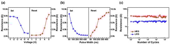 - Ge, S.; Wang, Y.; Xiang, Z.; Cui, Y. Reset Voltage-Dependent Multilevel Resistive Switching Behavior in CsPb1–xBixI3 Perovskite-Based Memory Device. ACS Appl. Mater. Interfaces 2018, 10, 24620–24626. [Google Scholar] [CrossRef]