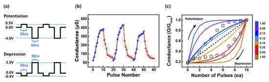 - Choi, J.-M.; Park, E.-J.; Woo, J.-J.; Kwon, K.-W. A highly linear neuromorphic synaptic device based on regulated charge trap/detrap. IEEE Electron Device Lett. 2019, 40, 1848–1851. [Google Scholar] [CrossRef]