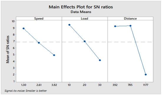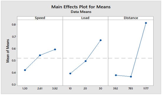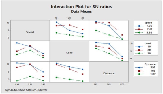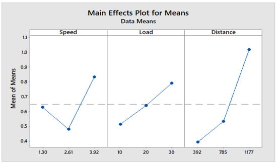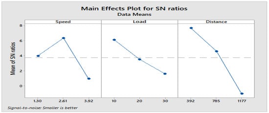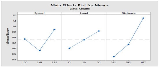 The sliding distance (P = 57.67%), sliding speed (P = 16.85%), load (P = 10.24%), and interaction of (B) sliding speed × (C) sliding distance (P = 6.64%) have a significant influence on the wear loss (Table 10). However, interactions of speed × load (A × B) (P = 3.09%) and load × distance (B × C) (P = 1.48%) do not have a substantial influence on wear loss as their values are reasonably less than the error (P = 4.57%) so they are neglected. From the response table for means, Table 11, it is observed that sliding distance has a key influence on wear loss followed by sliding speed and load.