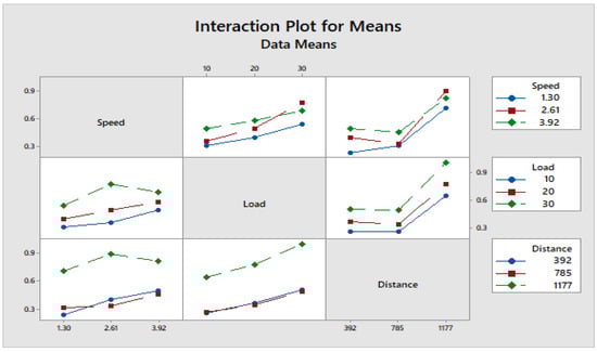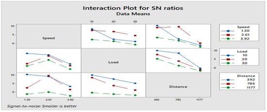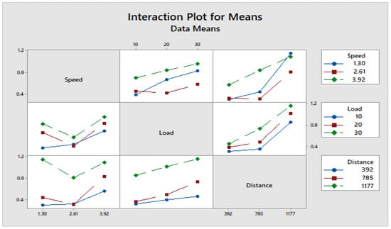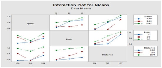 Figure 8 shows the influence of three control factors on weight wear loss of composite specimens C2. The main effects plot for means of Composite-C2 is shown in Figure 9, and it can be drawn from the figure that factors A3, B3, and C3 exhibit the minimum wear rate. The interaction graphs are shown in Figure 10 and Figure 11. From these figures, it is observed that the interaction (B × C) shows a significant effect on the wear loss.