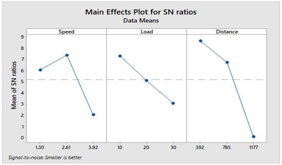 The experimental data for sliding wear are reported for SWPC10T30 (Composite-C1), SWPC10T40 (Composite-C2), and SWPC10T50 (Composite-C3) composites, and they are analyzed by Minitab Version 17, particularly suitable for design of experiments. When evaluating the experimental data, the interactions between the control variables are taken into account. The average wear loss for each factor at various levels is indicated by the mean response.