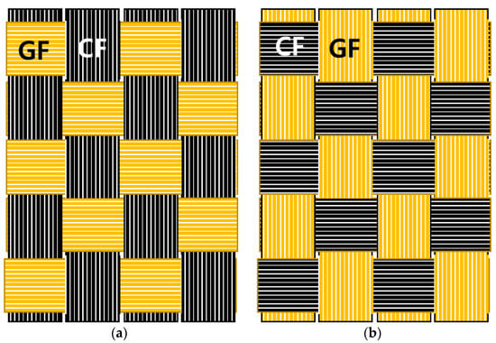 Fiber directions in the blended CF-GF fabrics. (a) CFGF①, (b) CFGF②.
