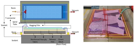 FRPs were obtained via the resin infusion molding method. In this method, the materials, such as fabrics and laminated films, are stacked on the mold and resin is infused under vacuum conditions. Figure 2 shows the order of the materials stacked on the mold. The peel ply, fabric, peel fly, release film, mesh, resin/vacuum injection line, and vacuum film were stacked in sequence. The peel ply was used to ensure an easy separation of the composite material and mold after hardening. The release film had perforations at regular intervals and was used to ensure uniform infusion of the resin into the fabric. The mesh was used to improve the fluidity of the resin, thereby ensuring an even distribution over the materials. The vacuum film was double-layered so that the reduced pressure state could be maintained in the secondary vacuum film even after the primary vacuum film was infused with the resin. An epoxy resin (Kinetix, Molendinar, Australia, R-118, viscosity: 300 cp) was injected into the mold under a pressure of 0.8 bar. The resin and a curing agent (Kinetix, H-141) were mixed at a ratio of 1000:250 g. The ratio of resin and curing agent used in this paper was determined through preliminary experiments as an optimal ratio condition. The mold was subjected to heat treatment at 60 °C for 4 h.