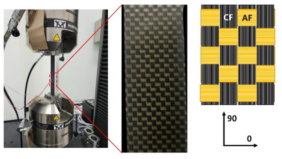 For example, Sun et al. [13] controlled the mechanical properties by mixing two types of single-fiber fabrics and changing the stacking pattern under a fixed fiber volume ratio of 50:50 v/v. The reason why the fiber mixing ratio was fixed at 50:50 v/v in the stacking pattern was that the mechanical properties of the fiber mixing were obtained close to the CF when the CF content was mixed at 60 wt.% or more. When the stacking pattern was changed from sandwich-stacking to cross-stacking (i.e., as the degree of mixing increased), the tensile strength increased by 23.42% from 354.39 to 437.15 MPa and the strain increased by 17.76% from 1.07% to 1.26%.