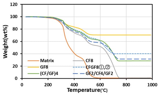 Figure 4 shows the pyrolysis graphs of the FRPs. The fiber and resin contents were evaluated by measuring the changes in mass due to the pyrolysis of the FRPs. The pyrolysis temperatures of the matrix were 219.39 and 444.45 °C. The pyrolysis temperatures of the CFs and AFs were 584.51 and 464.23 °C, respectively. No mass reduction was observed in the GFs because GFs do not undergo pyrolysis at temperatures below 1000 °C. Measuring the AF content via pyrolysis was difficult because the pyrolysis temperatures of the resin and AFs were similar. Therefore, the AF content was evaluated using the fiber mass that was measured during the manufacturing of the FRPs. Table 2 shows the fiber and resin contents of the FRPs obtained from mass measurements and TGA. For CF8, GF8, and AF8, the differences in the values of the fiber and resin contents obtained from mass measurements and TGA were negligible. The ratios of the fiber volume to resin volume were largely similar (50:50). However, the volume and mass ratios differed depending on the fiber type owing to the difference in fiber density. The density of GFs is 2.54 g/cm3, which is approximately 1.4 times higher than that of CFs and AFs. Therefore, the fiber to resin volume ratio of GF8 was 50:50, but the fiber to resin mass ratio was approximately 70:30. The thermal expansion coefficient values of the developed composites are shown in Table 2. It was confirmed that the difference in the thermal expansion coefficient obtained by a single carbon, glass, and aramid fiber and its mixing fibers was not significant. Accordingly, the thermal expansion coefficient according to fiber mixing will not have a significant effect on thermal deformation and stress.