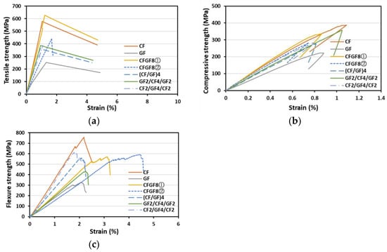 The strain values of the CF-GF blended and hybrid fabrics were higher than those of CF8. Moreover, CFGF8②, in which the GFs are arranged in the direction parallel to the flexural load direction, exhibited the highest strain value (3.99%). The tensile strength–strain and flexural strength–strain graphs shown in Figure 5 affirm these results. Unlike that in the hybrid fabrics, the increase in the strain value of CFGF8① was not accompanied by a decrease in the tensile strength. This can be attributed to the arrangement of CFs in the direction parallel to the tensile load direction, which affected the tensile strength; moreover, the hybrid effect—calculated as the ratio of the increased strain value due to the use of mixed fibers to the strain value of carbon fibers [23]—was significant due to the mixing of fibers with similar strains.