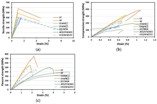 The tensile strength–strain and flexural strength–strain graphs shown in Figure 6 affirm these results. When the degree of mixing increased, the tensile strength increased while the strain decreased because the properties of the CFs were dominant. Conversely, when the degree of mixing decreased, the tensile strength decreased while the strain increased significantly because the properties of the AFs were dominant.