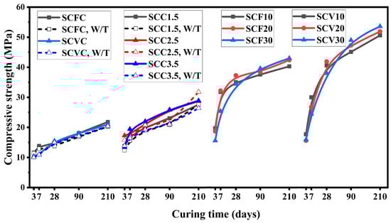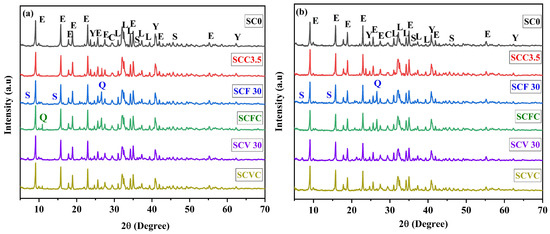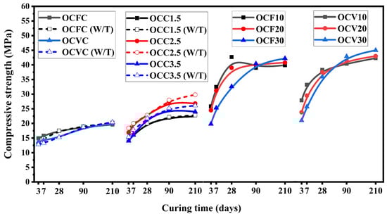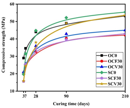 - Mechanical properties assessment: Preliminary tests were carried out to optimize parameters such as the setting time, water–cement ratio, and workability of the composite cement pastes. For optimizing the w/c ratio, OPC- and CSA-incorporated composite cements were prepared separately, each with FA, VA, and SCGs at different w/c ratios (0.4, 0.45, and 0.5). It was found that FA and VA blends require comparatively less w/c ratios than the ones made with the SCGs. Also, increasing the w/c ratio for the composite cement samples FA and VA decreases the compressive strength (CS). Using a w/c ratio of 0.4, a shrinkage in the hardened state for the FA- and VA-incorporated composite cements was observed, while at the same w/c ratio in the SCG-supplemented cement, the samples required extra water to make them workable. Raising the w/c ratio to 0.5 decreases the CS results for all composite cements made with FA, VA, and SCGs and shows a delay in setting and hardening for composite cements prepared with SCGs. At a w/c ratio of 0.45, all the composite cement samples were workable, and the VA showed better CS results as compared to the FA and SCGs. Thus, the water-to-cement (w/c) ratio was fixed at a 0.45 ratio. Composite cement cubes of 25 mm were prepared and cured under a calcium hydroxide-saturated solution for 3, 7, 28, 90, and 210 days. Five badges of samples were designed. The first badge of samples was prepared with FA at a 0, 10, 20, and 30% weight replacement level of the cement. The second set contained VA at a 0, 10, 20, and 30% weight replacement level of the cement. The third badge contained a 0, 1.5, 2.5, and 3.5% weight replacement level of the cement made with the SCGs. The fourth was a combination of 30% FA and 3.5% SCGs. The fifth was a combination of 30% VA and 3.5% SCGs. ASTM 401 C305 and ASTM 401 C109 [60,61] standards were used to execute the mixing procedure and the mechanical strength measurements, respectively. The effect of the curing temperature was also evaluated for samples containing SCGs, which were cured at 25 and 80 °C for 24 h. The samples containing SCGs were difficult to set at room temperature, so after several preliminary tests, an 80 °C temperature was chosen to enhance the setting. Compressive strength tests were performed after 3, 7, 28, 90, and 210 days of curing.