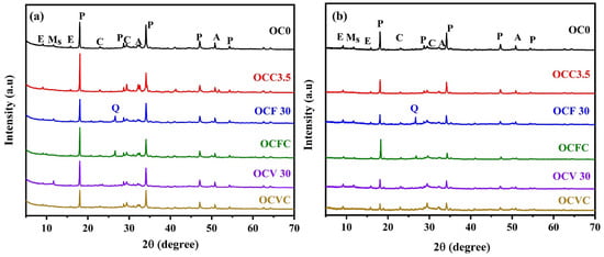 - X-ray diffraction (XRD): Selected samples were crushed and kept in isopropyl alcohol for three days to stop further hydration. These samples were then dried at 40 °C for 48 h, ground, and sieved through 75 microns to obtain powdered samples for the XRD analysis. A Bruker-D8 Advance diffractometer with a Cu-Kα radiation source (λ = 1.54) was used to analyze the mineralogical phases within a range of 2θ between 5 and 70° with a step size of 0.021 and a scan dwell time of 1 s [62].