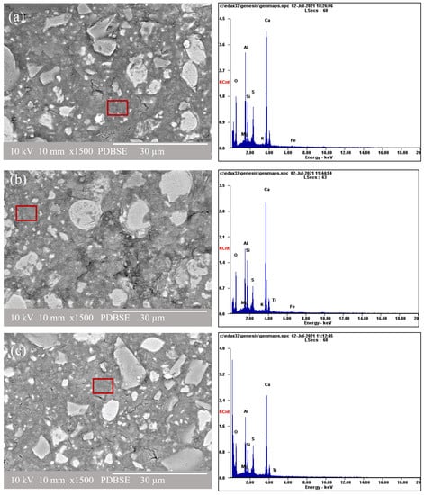 - Scanning electron microscopy and energy dispersive electron spectroscopy (SEM-EDS): Samples that showed better mechanical strength were chosen for morphological and structural analyses. These samples were kept in isopropyl alcohol for 48 h to stop the hydration and then dried at 40 °C for three days. Subsequently, these samples were mounted, polished, and gold coated for SEM and EDS analysis. The morphology and elemental composition of each sample was analyzed on SEM with EDS-attached equipment in the back-scattered electron mode (BSE), applying an accelerating voltage of 10 kV.