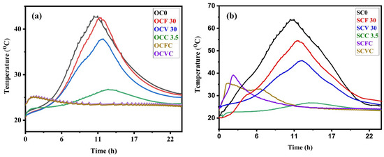 - Measurement of the hydration temperature: Each blended cement was mixed thoroughly with water and poured into a thermal disposable glass to study the hydration temperature. Copper constantan thermocouples were inserted into the cement paste and subsequently placed in a double-walled box, which was tightly sealed. Thermocouples were connected to a potentiometer, which recorded the temperature of the cement paste every second for a period of 24 h. The LabVIEW 2011 program was used to plot the hydration temperature vs. time graph for each of the studied cement pastes [63,64,65].