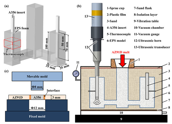 Commercial A356 aluminum and AZ91D magnesium alloys ingots were used as the raw materials to prepare the Al/Mg bimetal. The chemical compositions of the A356 and AZ91D alloys measured by energy dispersive spectroscopy (EDS) are listed in Table 1. A rod with a diameter of 10 mm and a height of 129 mm, shaped from A356 alloy and cut using a wire electrical discharge machine, was used as the solid insert. The surface of the A356 inserts were ground with silicon carbide papers from 240 grit to 2000 grit and washed with acetone in ultrasonic cleaners for 10 min. To remove the oxide film, the A356 inserts were immersed in lye (10 g/L NaOH) and a pickling solution (50% HF + 50% HNO3, volume ratio) for 20–40 s, respectively. Finally, the A356 inserts were washed with anhydrous alcohol and dried, then assembled with the expanded polystyrene (EPS, 12 kg/m3) foam model, as shown in Figure 1a. The assembled EPS foam model consisted of a sprue (35 × 35 × 160 mm3), an inner sprue (22 × 45 × 22 mm3) and two cubes (35 × 35 × 100 mm3) embedded with the A356 inserts. A water-based ceramic slurry with refractory properties was brushed and coated onto the surface of the assembled EPS foam model, and then dried in an air oven. K-type thermocouples (error values ± 0.75%) with 3 mm diameter stainless steel sheaths were embedded in the side of the coated foam (Figure 1a) to measure and record the temperature variation of the bonding interface of the Al/Mg bimetal during the LFCC process. The thermocouples were connected to a computer data collection system (National Instruments, Austin, TX, USA, data acquisition frequency 75 Hz).