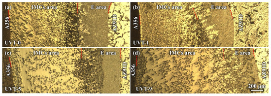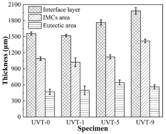 The average thickness of the IMC area of UVT-0 and UVT-1 was 1090 μm and 1024 μm, respectively. As the duration of UVT increased from 1 s to 9 s, the thickness of the IMC area showed an increasing trend, as shown in Figure 3. The average thickness of IMC area of UVT-5 and UVT-9 was 1122 μm and 1420 μm, respectively. However, the thickness of IMC area was slightly changed in the UVT-0, UVT-1 and UVT-5 specimens and reached maximum in the UVT-9 specimen. The average thickness of the E area was not obviously changed in the UVT-0, UVT-1 and UVT-9 specimen and reached maximum for the UVT-5 specimen, with an average value of 645 μm. This indicates that UVT has an influence on the formation of both IMC and eutectic layers.