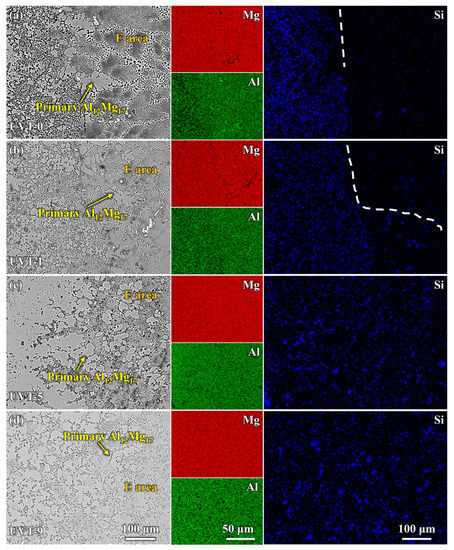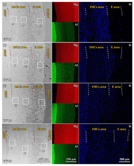 To further study the details of phase distribution and the morphologies and sizes of the Al/Mg bimetallic interface after different UVT durations, SEM and EDS observations were conducted. As shown in Figure 4, a gradient distribution of Al and Mg elements was displayed. Mg was most abundant adjacent to the AZ91D side, while Al was most abundant adjacent to the A356 side, as shown in Figure 4a. The distribution of Si is interesting; Si was almost exclusively distributed at the IMC area and aggregated locally at interface of IMC area and E area for the UVT-0 specimen. Our previous studies also found similar results in as-cast Al/Mg bimetal fabricated via LFCC [19,35]. In the UVT-1, UVT-5 and UVT-9 specimens, the distribution of Si appeared at the E area and became uniform as the duration of UVT increased, as shown in Figure 4b–d. Additionally, the diffusion distance of Si increased with UVT. This indicates that UVT could decrease elemental segregation and accelerate the diffusion of elements, which would have a positive effect on the bonding properties of the Al/Mg interface.