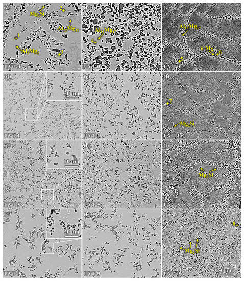 Figure 6 shows the microstructure of the Al/Mg bimetal interface of the UVT-0, UVT-1, UVT-5 and UVT-9 specimens. According to the binary phase diagrams of Al-Mg [39] and Mg-Si [40], as well as the EDS point results shown in Figure 6 and Table 2, the interfaces of the Al/Mg bimetal were mainly composed of Al-Mg IMCs (β-Al3Mg2 and γ-Al12Mg17), δ-Mg + γ-Al12Mg17 eutectic and Mg2Si. As shown in Figure 6a–c and Table 2, it can be seen that the IMC area was mainly composed of IMCs (β-Al3Mg2 and γ-Al12Mg17) + Mg2Si, and the E area was composed primarily of γ-Al12Mg17 dendrites, δ-Mg + γ-Al12Mg17 eutectic structure and few Mg2Si particles in the UVT-0 specimen. Additionally, the IMC area could be divided into a β-Al3Mg2 +Mg2Si area and a γ-Al12Mg17 + Mg2Si area. However, the boundary between the two area is not clear. The β-Al3Mg2 +Mg2Si area is adjacent to the A356 insert, while the γ-Al12Mg17 + Mg2Si area is adjacent to the E area. The formation of β-Al3Mg2 and γ-Al12Mg17 is related to the Al and Mg atomic concentration. The EDS maps shown in Figure 4 indicate that Al was most abundant adjacent to the A356 side and showed a decreasing gradient, so that the β-Al3Mg2 rather than γ-Al12Mg17 was prone to form adjacent to the A356 insert. The Al atom concentration decreased, while the Mg atom concentration increased as the location grew more distant from the A356 insert, it is prone to form γ-Al12Mg17. The proportion of Mg2Si at the γ-Al12Mg17 area as 33.7%, higher than that at the β-Al3Mg2 area (11.7%), indicating that Mg2Si was segregated at the γ-Al12Mg17 area, corresponding to the OM image (dark particles in Figure 2a) and EDS map (Figure 4a). Most of the Mg2Si particles in the IMC area were worm-like and had an average size of 8.3 μm.