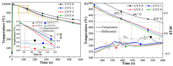 Two main noticeable reactions occurred during solidification in UVT-0, as shown in Figure 7b. According to the Al-Mg binary phase diagram, it could be concluded that the Al-Mg IMCs (β-Al3Mg2 and γ-Al12Mg17) were formed at a temperature between 455 °C and 441 °C, during the interval of tβ+γ from 387 s to 445 s. The γ-Al12Mg17 + δ-Mg eutectic area was formed at a temperatures between 441 °C and 418 °C, during the interval of tE from 445 s to 586 s. With the increase of UVT duration, the two main reactions during solidification did not change (i.e., the formation of Al-Mg IMCs and the formation of γ-Al12Mg17 + δ-Mg eutectic). This indicates that there was no new phase formed in the UVT-1, UVT-5 and UVT-9 specimens compared with the UVT-0 specimen, in accordance with the SEM and EDS results shown in Figure 4 and Figure 6. However, the formation temperatures and time of Al-Mg IMCs and eutectic in the UVT-0, UVT-1, UVT-5 and UVT-9 specimens are different, as they were affected by the cooling rate and solute concentration.
