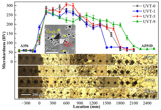 The microhardness distribution at different locations of the Al/Mg interface layer is shown in Figure 8. It can be seen that the microhardness of A356 does not changed with UVT. The microhardness of the IMCs (220 HV–310 HV) exhibits a higher value than that of eutectic (187 HV–220 HV). The microhardness of AZ91D for UVT-1, UVT-5 and UVT-9 specimen is slightly higher than that for the UVT-0 specimen (65 HV), indicating that UVT has an effect on improving the microhardness of the AZ91D matrix. As shown in the insert SEM image in Figure 8, long cracks at edges of the Vickers indentation are visible, due to the IMCs with high microhardness being brittle. It is also noteworthy that the crack propagation was inhibited by the Mg2Si particles. The Mg2Si particles changed and inhibited the propagation path of cracks and increased energy consumption during crack propagation, which reduced the length of cracks. This indicates that the refined and homogeneously dispersed Mg2Si particles induced by UVT could effectively suppress the propagation of cracks during deformation, which is beneficial for improving the mechanical properties of Al/Mg bimetals.