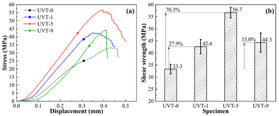 Results of shear strength testing: (a) stress-displacement curves and (b) shear strength of the Al/Mg bimetals.
