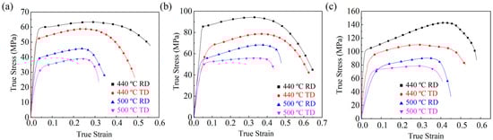The EBSD results show that the fractions of HAGBs along RD are all larger than TD. Combining the results in IPF maps, it can be seen that the DRX degree of TD is obviously higher than that of RD. Generally, under hot deformation conditions, the most important factor affecting the peak stress of aluminum alloys is the degree of DRX [,,]. Consequently, the higher degree of DRX results in lower PS along TD, although the greater difficulty in opening the slip system at the beginning of the deformation.