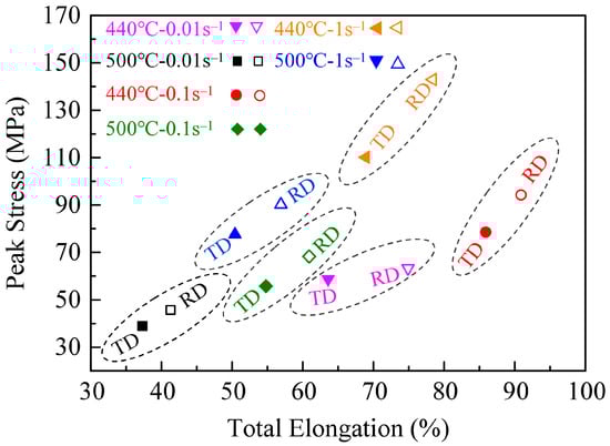 Figure 1 shows the flow curves of 2195 Al–Li alloy samples, which are tested at 440 and 500 °C, and the strain rates of 0.01 s−1, 0.1 s−1, and 1 s−1. It can be seen that the tensile stress first increases with the rising strains during the elastic deformation stage and then decreases after approaching peak stress (PS). Subsequently, with a further increase in strain, the flow stress dramatically decreases until the fracture occurs. Figure 2 displays the variation in PS and total elongation (EL) with the different deformation conditions. Overall, the PS and EL along RD are all larger than the results of TD. And, the effect of the loading direction on stress is greater than that on EL. Under the same deformation condition, the PS values along RD are apparently larger than TD. For the tests carried out at 500 °C-0.01 s−1, the PS values of the sheets stretched along the RD and TD are 45.7 MPa and 38.9 MPa, respectively. The difference is more obvious under higher strain rates. The PS is 110.2 MPa of the sheet stretched along TD, and the value of RD reaches 142.9 MPa under 440 °C-1 s−1. According to the previous studies [,], to better characterize the evolution of PS along RD and TD, the PS anisotropy can be defined as the difference value (D-value) between the PS along the RD and TD divided by the minimum PS value (PSmin), as shown in Equation (1). Similar to the PS, the EL anisotropy can be defined by Equation (2).