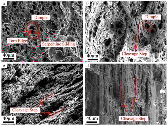 Fracture morphology of different deformation conditions: (a) 440 °C-0.1 s−1-RD, (b) 440 °C-0.1 s−1-TD, (c) 500 °C-0.1 s−1-RD, and (d) 500 °C-0.1 s−1-TD.