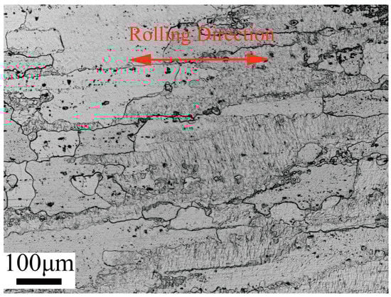 Figure 4 shows the OM image of the initial 2195 Al–Li alloy sheet. Most of the initial coarse grains are elongated along RD and form a bonded structure. Figure 5 displays the EBSD results of the initial sheet. The high angle grain boundaries (HAGBs, misorientation angle > 15°) and the low angle grain boundaries (LAGBs, misorientation angle 2–15°) are represented by the black and white lines, respectively. It can be seen that the fraction of LAGBs achieves 77.5% in the misorientation angle distribution (MAD) map.