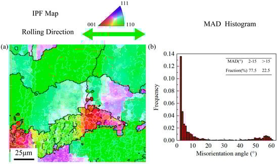 IPF map and MAD histogram of the 2195 Al–Li alloy initial sheet: (a) IPF map and (b) MAD histogram.