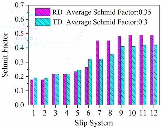 With respect to the orientation of the grains in Figure 5, most initial grains have <110> orientation, and only a small amount of <100> orientation and <111> orientation equiaxed grains with small sizes exist. Schmid factor can reflect the hardness of grain slip, i.e., the hardness of plastic deformation, which can be calculated from EBSD data [,,]. The plastic deformation of metals is a complex process involving the interaction of multiple grains. Therefore, the study on the Schmid factor of a single grain in the initial material is meaningless for investigating the hot tensile properties of Al–Li alloy sheets along different loading directions. So, in order to study the relationship between the orientation of the initial sheet and the anisotropy of tensile properties of the cold-rolled sheet, the average Schmid factors of the whole <110> grains stretched along RD and TD were counted, and the statistics results are listed in Table 3 and Table 4. To better compare the Schmid factor of different loading directions, the results are presented in the form of the bar chart in Figure 6. The average Schmid factor along RD is 0.35, and the result of TD is 0.3. At the same time, Table 3 and Table 4 show that the maximum Schmid factor along RD is also larger than TD. Therefore, it can be considered that the deformation along RD is easier to start than TD under hot tensile conditions.