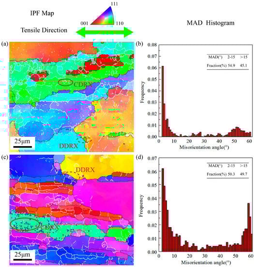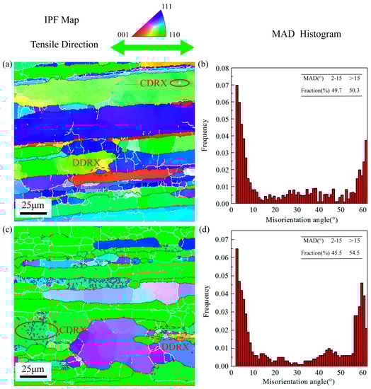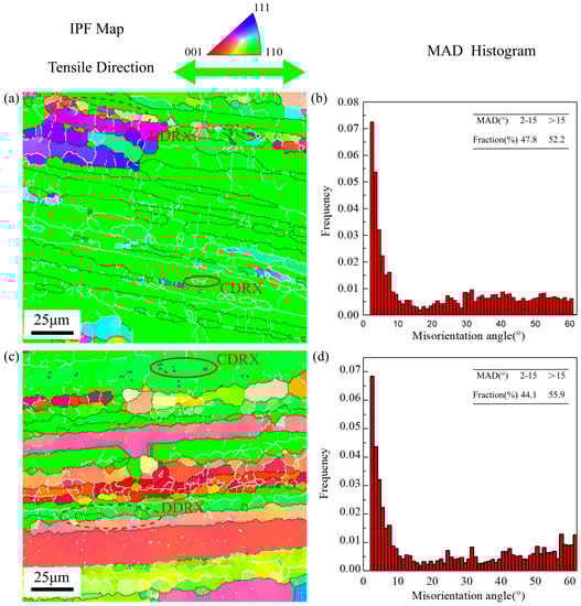 Figure 7 displays the EBSD results of the samples stretched under the deformation conditions of 440 °C-0.1 s−1-0.6 (strain) along RD and TD. It can be seen that the grains stretched along RD noticeably elongated along the tensile direction from Figure 7a, and a certain amount of DRX grains occurs in the initial grain boundary position (discontinuous dynamic recrystallization (DDRX)) and inside the initial grains (continuous dynamic recrystallization (CDRX)). Most of the DRX grain boundaries are still LAGBs. The fraction of the HAGBs is 45.1%. Figure 7c displays the EBSD results of the samples stretched along the TD. As can be seen, there are more DRX grains, especially small-sized CDRX grains, within the initial coarse grains compared with RD, and the fraction of HAGBs rises to 49.7%. Similar to RD, the grains of TD also significantly elongate along the tensile direction, and the original banded structure along the rolling direction has disappeared. However, due to the distinction in the shape of initial grains, the grains stretched along TD produced more significant shape changes during the hot tensile process. The influence of the initial grain shape on the dynamic softening mechanism will be discussed later.