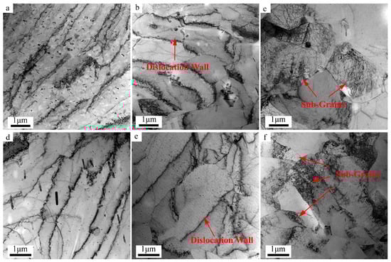 TEM images of microstructure morphologies under different deformation conditions: (a) 440 °C-0.1 s−1-0.4-RD, (b) 440 °C-0.1 s−1-0.6-RD, (c) 440 °C-0.1 s−1-0.65-RD, (d) 440 °C-0.1 s−1-0.4-TD, (e) 440 °C-0.1 s−1-0.5-TD, and (f) 440 °C-0.1 s−1-0.6-TD.