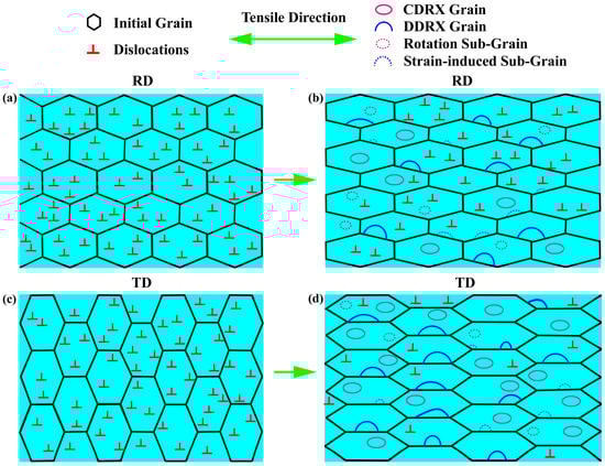The model of DRX during the process of hot tensile deformation along RD and TD: (a) initial grains along RD, (b) hot tensile deformation grains along RD, (c) initial grains along TD, and (d) hot tensile deformation grains along TD.