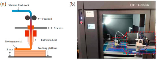 In this paper, the PLA granules and short CFs were both purchased from Dongguan ANT Plastic Technology Co., Ltd. (Dongguan, China). The dimension and diameter of CF were 40–60 μm and 15–20 μm, respectively. Prior to the blending process, the short CFs were modified with 20 wt.% H2SO4 solution for decreasing the surface energy. Moreover, the KH570 style silane coupling agent was used to improve the performances of PLA filament and PLA/CF filament. The PLA filament and PLA/CF filament were manufactured by a TY-7004 type single screw extrusion equipment at the extrusion temperature of 180 °C and screw speed of 200 r/min. The CF content of the PLA/CF filament was 15 wt.%. The diameters of PLA filament and the PLA/CF filament were both 1.75 mm. Before printing, the PLA and PLA/CF filaments were desiccated in the NJ101-5 type drying box at the temperature of 60 °C and kept for 50 min. The PLA and PLA/CF samples were built using a DF-G3545 type 3D printer. The production process of PLA and PLA samples is presented in Figure 1. The 3D models of FFF-ed samples were built using CAD software and were translated to machine language using Cura 15 slice software. Then, the FFF style printer was employed to establish the entity object. The filaments were heated to the molten state and extruded. Finally, the molten materials shaped and hardened on the platform. The platform temperature was set as 50 °C for reducing the residual stress. During the FFF process, the material specie was the only variable. According to our experiences, the suitable technological parameters for manufacturing PLA and PLA/CF samples are listed in Table 1.