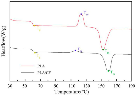 Figure 6 displays the DSC curves of PLA and PLA/CF samples prepared using the FFF method. The glass transition temperature (Tg), cold crystallization temperature (Tcc) and melt temperature (Tm) of FFF-ed samples are listed in Table 3. The Tg of the PLA sample and PLA/CF sample were 61.32 °C and 62.13 °C, respectively. The result indicated that the introduction of CF had little influence on the Tb of the FFF-ed PLA sample. By contrast, after the introduction of CF, the Tcc and Tm of the PLA sample decreased from 124.75 °C to 115.63 °C and increased from 151.91 °C to 159.87 °C, respectively. The result demonstrated that the introduction of CF had significant influence on the Tc and Tm of the FFF-ed PLA sample. Furthermore, the incorporation of CF resulted in the cold crystallization peak of the FFF-ed PLA sample being significantly moved to left, which meant that the FFF-ed PLA/CF sample was easy to crystallize. The reason was attributed to the heterogeneous nucleation dominating the crystallization process after the incorporation of CF, which impacted the crystallization rate much more than the crystallization mechanism of the PLA sample [33]. The result was confirmed through the XRD pattern in Figure 4. In general, the high Xc of the FFF-ed sample was beneficial to improving the thermal stability [34]. Therefore, the thermal stability of the PLA/CF sample is stronger than that of the PLA sample.