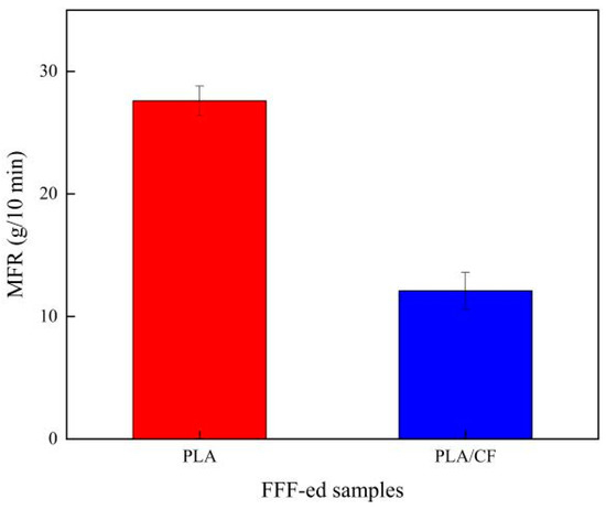 Figure 7 illustrates the MFR of PLA and PLA/CF samples produced using the FFF method. The MFR of PLA sample was 27.6 g/10 min, while that of the PLA/CF sample was only 12.1 g/10 min. The reasons of this result could be illustrated as follows: (1) The reinforced phase of CF existed in the PLA sample and caused the movement obstruction of the PLA molecular chain and the increase of internal friction, resulting in the MFR of the PLA/CF sample decreasing [35]. (2) In addition, the melt temperature and crystallization degree of PLA/CF sample were higher than those of PLA sample, which was proven through the DSC curves in Figure 6. The high melt temperature and crystallization degree led to the MFR of the PLA/CF sample decreasing [36]. Therefore, these reasons caused the MFR of PLA sample being larger than that of the PLA/CF sample.
