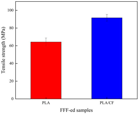 Figure 8 shows the tensile strength of the PLA and PLA/CF samples manufactured using the FFF technique. The tensile strengths of the PLA and PLA samples were 64.27 MPa and 91.58 MPa, respectively. After the CF was introduced, the tensile strength of PLA sample increased obviously. The reason for this phenomenon could be illustrated as the CF of the PLA/CF sample serving as the action of reinforcing frame structure and heterogeneous nucleation. On the one hand, the tensile strength of CF was up to 4000 MPa, which could enhance the tensile strength of the PLA/CF sample distinctly. On the other hand, the heterogeneous nucleation of CF contributed to the growth of the crystallization degree, resulting in the tensile strength of the PLA/CF sample increasing. This result is similar to the study of Zhu et al. [37] about heterogeneous nucleation for enhancing the tensile strength of poly(butylene succinate)/PLA composites. The internal mechanism of its stress deformation can be further explained through the mechanism model established by Kumar Mishra et al. [38]. In addition, the uniform dispersion of CFs in the PLA could have effectively transferred and absorbed the external load, which further enhanced the tensile strength. This outcome was proven by the research of Qian et al. [39] about the function of CF in the PLA-thermoplastic poly(ether)urethane composites and the research of Malagutti et al. [40] about Tensile properties of FDM 3D-printed wood flour-filled polymers and mathematical modeling through classical lamination theory.