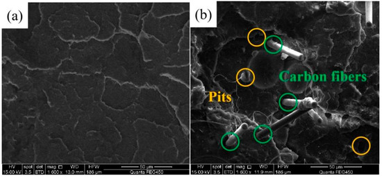 Figure 9 exhibits the SEM photographs of the fractured surface morphology of the PLA and PLA/CF samples built with FFF technology. Figure 9a shows the fractured surface morphology of the PLA sample presenting relatively smooth. By comparison, the fractured surface morphology of the PLA/CF sample appeared rough and uneven (seen in Figure 9b). SEM images indicated that the fractured behavior of PLA sample varied from brittle fracture to ductile fracture after the introduction of CF, which was similar to the research proposed by Raj et al. [41]. Furthermore, some obvious pits and damaged CFs existed in the fractured surface of the PLA/CF sample. The result is attributed to the fine adhesion force between the CFs and PLA matrix. The minor pits were produced from the stretch of CFs in the PLA matrix during the tensile test. In addition, the carbon fibers distributed in the PLA/CF sample pointed to the same orientation, which indicated that the suitable layer thickness contributed to the uniform arrangement of CFs orientation [42].