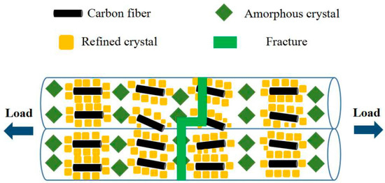 Figure 10 demonstrates the reinforcement mechanism of carbon fiber on the properties of the PLA sample. The low MFR of the PLA/CF sample caused the increased adhesion force between filaments, which resulted in the mechanical property of the PLA/CF sample improving [43]. Meanwhile, the same orientation of CFs in the PLA/CF sample could effectively transfer and absorb the external load, which could significantly improve the mechanical property [44]. Moreover, the uniform distribution of carbon fibers dispersed in the PLA/CF sample acted as the heterogeneous nucleation and decreased the crystallization temperature, which increased the degree of crystallization and enhanced the mechanical property of PLA/CF sample [45].