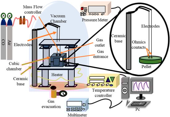 The NiSb2O6 pellets were installed in the measurement chamber with a vacuum capacity of 10−3 Torr (Figure 1), and measurements were made in atmospheres of C3H8 and CO. For this, concentrations of 1, 5, 50, 100, 200, 300, 400, and 500 ppm of C3H8, and 1, 5, 50, 100, 200, and 300 ppm of CO were injected into the system. The operating temperatures were 100, 200, and 300 °C. The gas concentrations were controlled using a Leybold detector. The operating temperature was monitored using a highly sensitive type K thermocouple. The pellets’ varielectrical resistance was recorded using a Keithley 2001 digital multimeter (Beaverton, OR, USA). The pellets’ response was calculated using the equation reported in [,]: