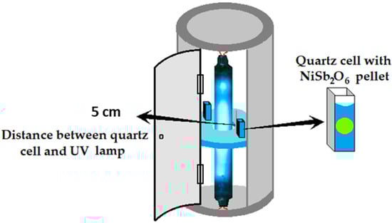 To analyze their photocatalytic activity, 0.25 g of NiSb2O6 powders were pressed into pellets (Ø 5 mm) and suspended in a quartz cell containing 3.5 mL of a 5 ppm malachite green aqueous solution. The suspension was kept in the dark for 30 min to reach the adsorption equilibrium. Then the suspension was put into an annular photoreactor equipped with a 15 W UV-254 nm lamp (Figure 2) and irradiated for 200 min. The discoloration was monitored at 30 min intervals using a JASCO V-670 UV-vis spectrophotometer.