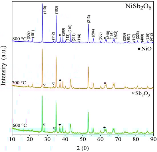 The nickel antimonate synthesis was conducted using a wet chemistry method reported in [,]. A stoichiometric 2:1 molar ratio of nickel nitrate hexahydrate and antimony trichloride was used. A total of 1.45 g of Ni(NO3)2ꞏ6H2O, 2.80 g of SbCl3, and 2 mL of ethylenediamine (C2H8N2) were separately used; 5 mL of ethanol was added to the first two reactants, while 10 mL of ethanol was added to the C2H8N2. Each solution was kept under constant stirring at 300 rpm for 20 min at room temperature to homogenize the mixtures. After 20 min of stirring, the Ni(NO3)2ꞏ6H2O solution was added to the C2H8N2 solution. Finally, the SbCl3 solution was added to the mixture of Ni(NO3)2ꞏ6H2O and C2H8N2. The resulting solution was constantly stirred for 24 h at 25 °C. After completion of the stirring time, an evaporation process of the ethanol was carried out using microwave radiation, employing a General Electric ST0912C01352 domestic oven at a power of 70 W. The microwave radiation was applied in intervals of 60 s until a paste was formed, which was dried at 200 °C for 8 h and calcined at 600, 700, and 800 °C using a Novatech (Scottsdale, AZ, USA) muffle at a heating rate of 100 °C/h.