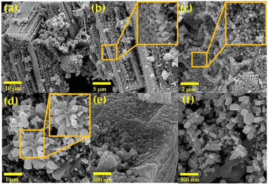 Figure 4 shows SEM micrographs of powders of the NiSb2O6 calcined at 800 °C. Magnifications used for the material’s microstructural analysis were 6.0, 10.0, 15.0, 60.0, and 70.0 kx. Based on the images, it was found that the material’s entire surface is composed of particles in the form of rods, polyhedra, and other irregular shapes. Figure 4a–c show a high agglomeration of polyhedral particles and other particles forming rods of different lengths. These particles agglomerated in such a way that they formed irregular structures of varying sizes (Figure 4d–f). In Figure 4d,f, the growth of smaller microrods can be observed, which had a common point of origin but grew in different directions. This formation of microrods is mainly attributed to the fact that, during the thermal treatment, the growth of very fine particles is favored, as well as their subsequent agglomeration, resulting in the formation of characteristic morphologies as shown. In addition, the residence time of the material (5 h) at 800 °C played a significant role in the morphologies’ growth.