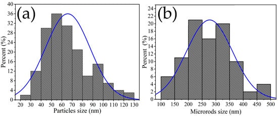 The size of the microrods was estimated in the range of 100 to 500 nm, with an average of ~277 nm and a standard deviation of ~±83 nm (Figure 5a), while the size of the other particles was estimated in the range of 20 to 130 nm, with an average of ~65 nm and a standard deviation of ~±21 nm (Figure 5b). Multiple SEM micrographs, where the particles were clearly identifiable, were considered for the microstructures’ size calculation. Several authors have reported that the use of chelating agents such as ethylenediamine in the synthesis promotes the formation of such microstructures. This is because ethylenediamine reacts with temperature to form a mesh that captures metal particles, which agglomerate as the calcination temperature increases, resulting in the growth of rods and other morphologies []. Studies have also suggested that the use of ethylenediamine can lead to the formation of diverse nanostructures including nanoparticles, nanorods, nanowires, porous particles, and hexagonal nanostructures [,]. The microstructures in our study followed the crystallization principles established by LaMer and Dinegar []. According to these principles, nuclei formed due to chemical reactions until a saturation limit was reached, after which the particles grew until the system’s solubility reached equilibrium. This condition favored the production of morphologies such as those shown in Figure 4d–f.
