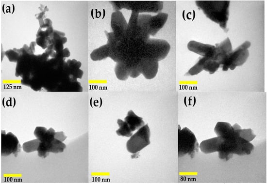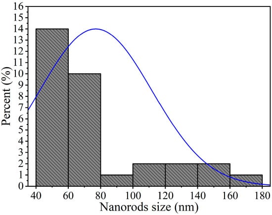 To further examine the microstructure of the nickel antimonate calcined at 800 °C, transmission electron microscopy (TEM) in imaging mode was used. The resulting images, shown in Figure 6, reveal mainly nanorods and other particle types. This analysis confirmed the SEM results, which identified rods of different sizes and irregularly shaped nanoparticles measuring ~90 nm. Their thickness caused dark areas in the nanostructures, which impeded electron transmission. The nanorods and nanoparticles seen in Figure 6a–f agglomerated together due to the effect of the calcination temperature and ethylenediamine. These particles varied in shape and size and had small growth nuclei that caused the nanorods to grow in different directions []. The nanorod sizes ranged from 40 to 180 nm (Figure 6b–f), with a mean size of ~77 nm and a standard deviation of ±34 nm (see Figure 7).