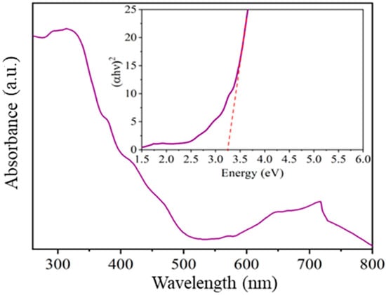 To identify the characteristic absorbance bands and determine the value of the forbidden band of the oxide calcined at 800 °C, UV-vis spectroscopy was employed. In Figure 8, absorbance is shown as a function of the compound’s wavelength. In the 200–500 nm range, characteristic absorption bands of a material belonging to the family of semiconductor oxides with a trirutile-type structure were identified [,,]. On the other hand, in the 600–800 nm range, bands associated with the oxygen-metal bond (in our case, Ni-O) were identified [,].
