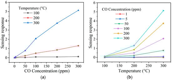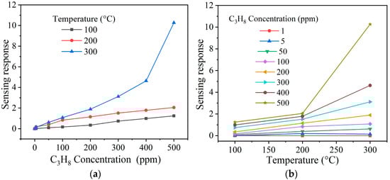 To check nickel antimonate’s detection ability to different gas concentrations, its pellets were subjected to 1–300 ppm of CO and 1–500 ppm of C3H8 at temperatures 100, 200, and 300 °C. The results are shown in Figure 9 and Figure 10 as a function of the test gas concentration and the operating temperature. In the case of CO (Figure 9a,b), the material’s response increased as the concentration and operating temperature rose. This increase is mainly attributed to oxygen species (like , , or ) on the surface of the pellets, which rapidly reacted when the CO was injected into the measurement chamber. Furthermore, the excellent oxide response is associated with higher oxygen desorption due to the operating temperature [,]. When the pellet was at 100 and 200 °C, a slight increase in gas sensing response was recorded: ~0 and ~1 at 300 ppm of CO, respectively. This low response was because the thermal energy was insufficient for the oxygen species to react on the pellets’ surface [], which induced poor kinetic activity between them, the material’s particles, and the CO molecules [,]. However, when the temperature was raised to 300 °C, values of 0, 0, 1, 2, 4, and 5 were recorded, corresponding to 1, 5, 50, 100, 200, and 300 ppm of CO. The maximum response at 300 °C was ~5 at 300 ppm of CO. The excellent response is mainly attributed to the fact that the oxygen species and are highly reactive at temperatures greater than 150 °C compared to those species () that appear below that temperature [,]. It has been reported that an increase in the operating temperature favors a high interaction between the pellets’ surface with the CO molecules [], thereby provoking variation in electrical resistance and, therefore, an increase in response, as occurred in our case (Figure 9a,b).