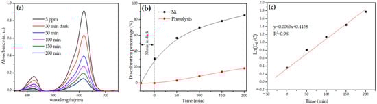 (a) Evolution of MG’s photo discoloration, (b) MG’s discoloration percentage, (c) MG’s first-order kinetic photodegradation.
