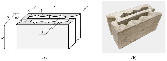 Commonly used concrete wall hollow blocks are used for erecting the exterior and interior structural walls of buildings, especially underground floors. Their role in the construction of the wall, like that of clay blocks, consists of the transfer of vertical loads to the foundation [1,2]. This is provided by the concrete frame of the hollow block, which usually has alternately shaped through-holes. There are studies in the literature that have examined concrete with the addition of SBR (styrene–butadiene rubber) granules obtained from the processing of used car tires [3,4,5,6], polyethylene terephthalate in the form of PET (Poli(EtylenoTereftalanu)) flakes, or granules from used plastic bottles [7,8,9,10,11], but few publications have studied concrete modified with these two additives [12,13,14]. Contemporary concrete mix designs take into account waste management [8,12,15,16,17] and the use of “substitutes” that could replace some of the components needed to produce a cement matrix composite material. This is an important aspect of sustainable building [18]. Environmental protection is an important issue that should be taken into account in scientific studies. Examples of such activity may be seen in publications [19,20,21,22].