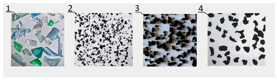 Recycling materials: 1—PET flakes, 2—SBR rubber granulate 0 ÷ 1 mm, 3—SBR rubber granulate 0.8 ÷ 2 mm, and 4—SBR rubber granulate 2 ÷ 4 mm.