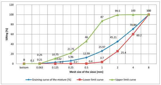 Based on the calculated percentages of the individual fractions of the composed aggregate mixture, a grain size curve was plotted between the limiting curves (Figure 5).