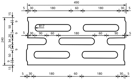 An Alpha 25 concrete hollow block was used as a comparison for the mechanical vibration reduction tests. It was purchased from the C.J. Blok Sp. z o. o. from Głogów Małopolski, Poland. The comparative hollow block accepted for testing had external dimensions of length × width × height, respectively, equal to 490 × 240 × 240 mm. These dimensions were identical to the dimensions of the new type of APS hollow concrete block. The area of the through-holes in the Alpha block was 1176 cm2 and was also comparable to the area of the holes in the new APS block, which was 1124 cm2. The basic dimensions of the Alpha block are shown in Figure 6 [74], while an example of the Alpha hollow block is shown in Figure 7.